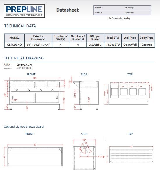 Gas Steam Table Cabinet GSTC60-4O 60″ 4 Wells, Optional Sneeze Guard