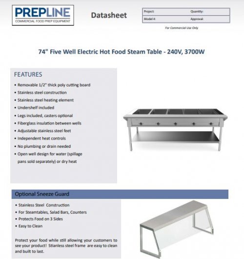 Service hot fresh food to your customers with Prepline?s stainless steel gas steam table with undershelf. This Gas steam table features a durable stainless steel construction that can withstand any commercial kitchen. With 3,500 BTU jet burners per well, your food will stay hot for as long as you need and with configurations for up to 5 wells, you can serve as many or as few options as you’d like. Independent controls allow you to control the temperature of each well as needed. An 8? cutting board is included. Installed casters are available options. Sealed well steam tables do not require spillage pans.