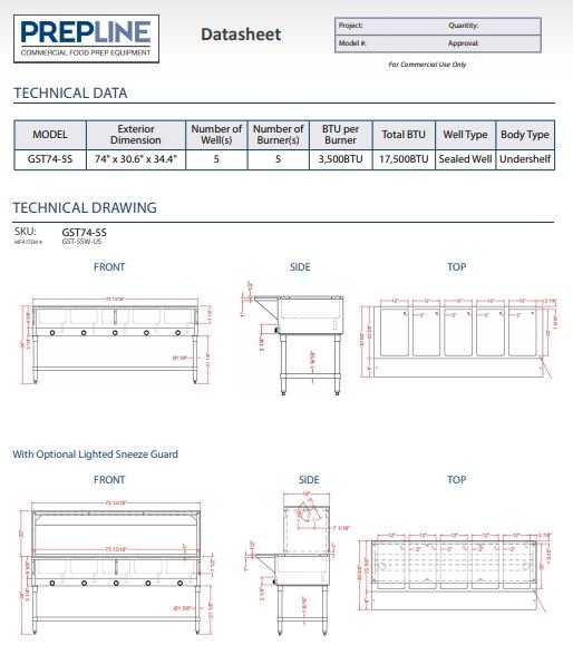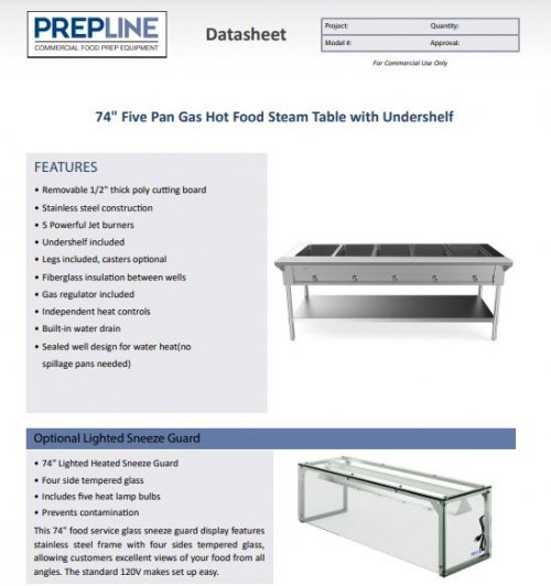 73.8 inch Gas Steam Table, 5 Well, Optional Sneeze Guard