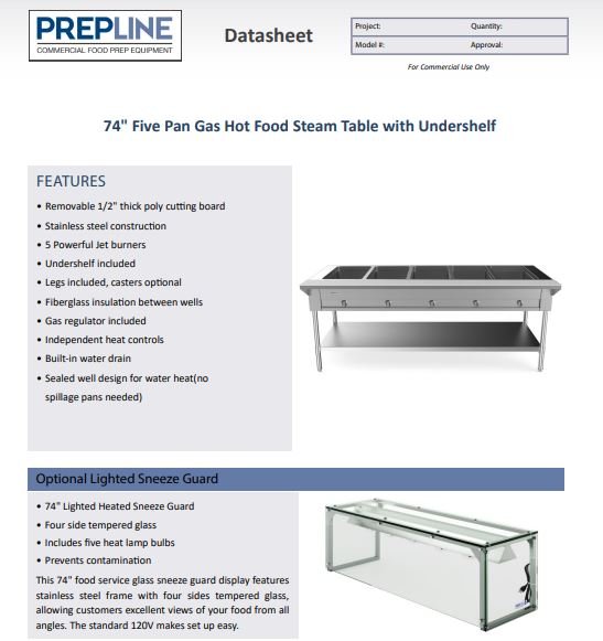 Prepline 74″ Five Well Gas Hot Food Steam Table with Undershelf