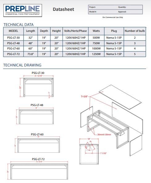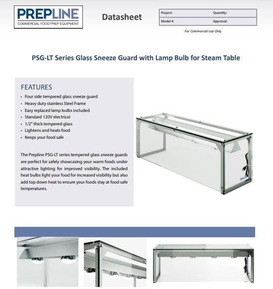 The Prepline PSG-LT series tempered glass sneeze guards are perfect for safely?showcasing your warm foods under attractive lighting for improved visibility. The included heat bulbs light your food for increased visibility but also add?top down heat to ensure your foods stay at food safe temperatures.