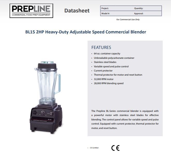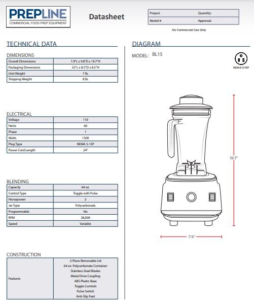 Item: Prepline BL15 Drink Machine 2HP Heavy-Duty 64oz Adjustable Speed Commercial Blender – 110V