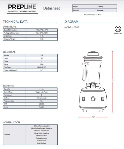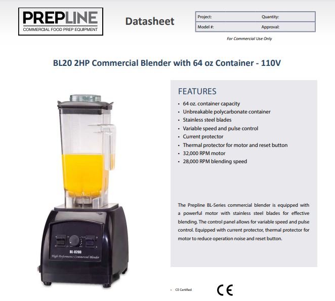 Item: Prepline BL20 2HP Commercial Blender with 64oz Container – 110V