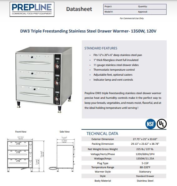 Item: Prepline DW3 Triple Freestanding Stainless Steel Drawer Warmer- 1350W, 120V