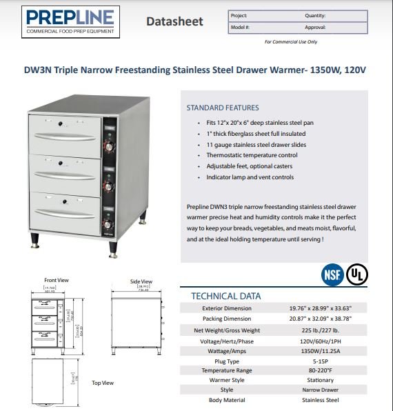 Item: Prepline DW3N Triple Narrow Freestanding Stainless Steel Drawer Warmer- 1350W, 120V