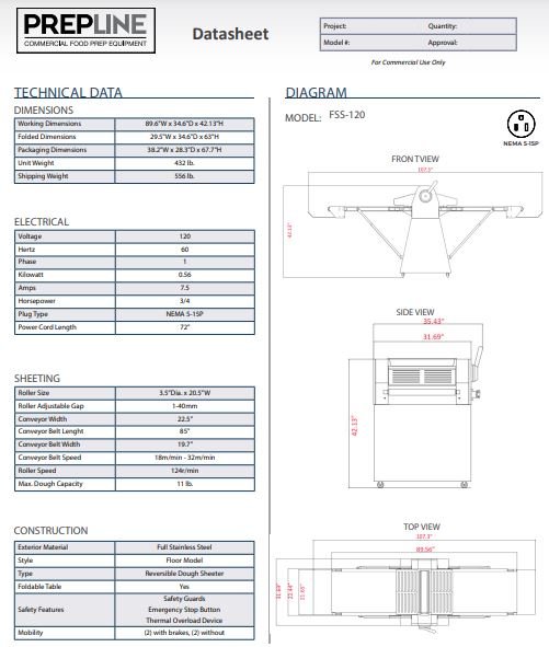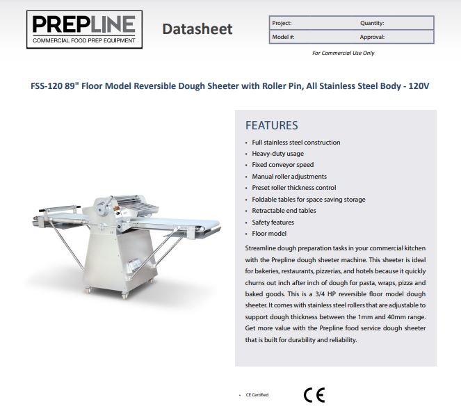 Item: Prepline FSS-120 Stainless Steel Reversible 120v Floor Model Dough Sheeter