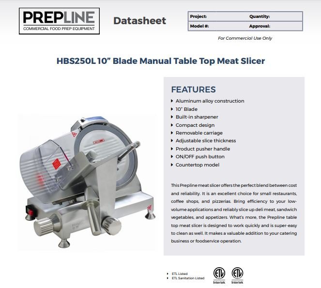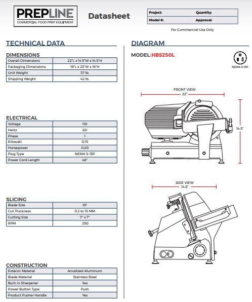 Item: Prepline HBS250 10″ Blade Commercial Electric Meat Slicer