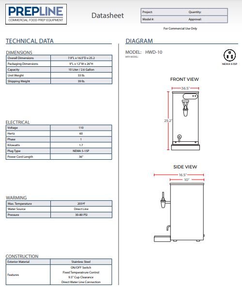 Make hot water for tea or drinks instantly and continuously with the Prepline HWD10 2.6 gallon hot water diepsenser. Featuring a water line and drop tray, this commercial unit can preheat up to 10 liters, or?2.6?gallons at a time, great for high volume drink service. Stainless steel finish looks great in any establishment and is easy to clean. 120V plug makes this a true plug and play choice.