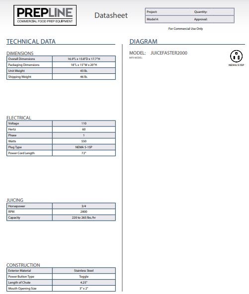 Item: Prepline JUICEFASTER2000 Commercial 3/4 HP Electric Juice Extractor