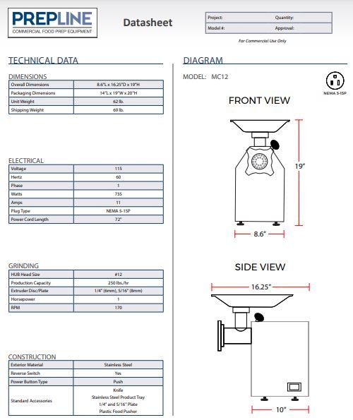 Item: Prepline MC12 #12 HUB 1 HP 250 lb. Meat Grinder