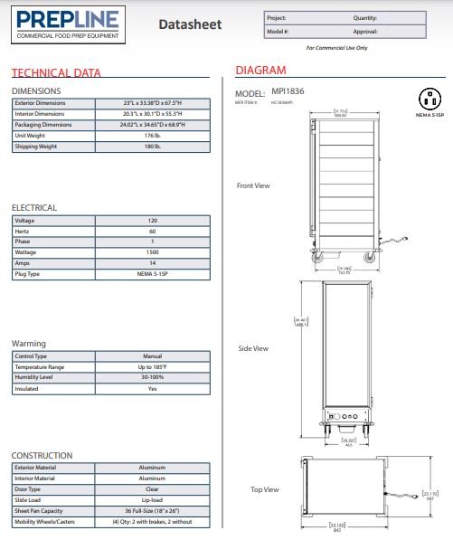 Item: Prepline MPI1836 Full Size Insulated Heater Proofer Cabinet with Clear Door – 120V