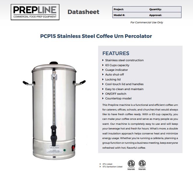 Item: Prepline PCP15 Stainless Steel Coffee Urn Percolator, 63 Cups