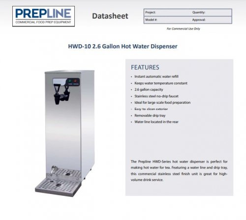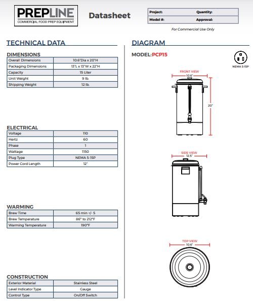 This Prepline machine is the perfect coffee urn for hotels, restaurants, and caterers. Thanks to the percolator design, this coffee urn will consistently churn out hot quality coffee. The stainless steel design makes this unit durable so it can deliver over the long term. Keep your audience or customers refreshed with hot coffee with the Prepline 63-cup coffee urn.