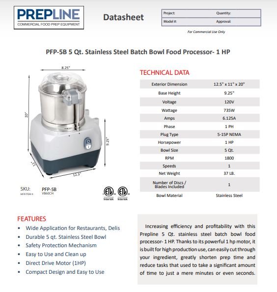 Item: Prepline PFP-5B 5 Qt. Stainless Steel Batch Bowl Food Processor- 1 HP