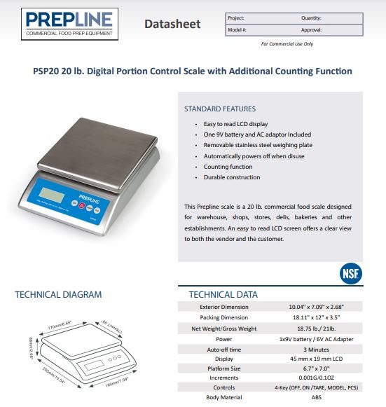 This Prepline scale is a 20 lb. commercial food scale designed for warehouse, shops, stores, delis, bakeries and other establishments. This 10.5? wide model comes with a durable ABS construction, and other features designed to enhance the reliability of the unit over the long term. A easy to read LCD screen offers a clear view both the vendor and the customer. If you are looking for a high precision bakery weight scale to suit the needs of your establishment, the PSP20 is an excellent product choice. Weight capacity is 20 lb. x .1oz. Includes stainless steel removable platter.