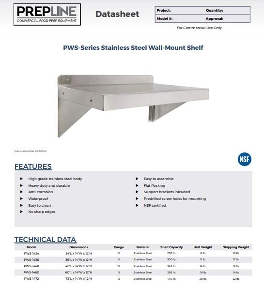 Prepline PWS-1424 14″X24″ Stainless Steel Wall-Mount Shelf