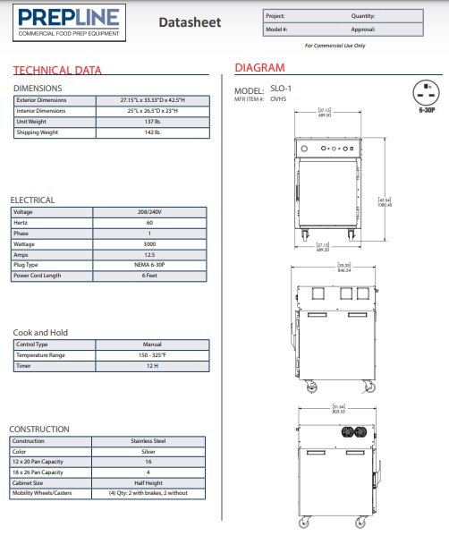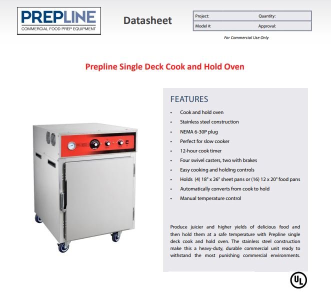 Item: Prepline SLO-1 Single Slow Cook and Hold Oven