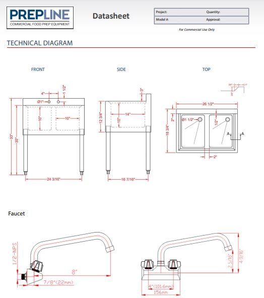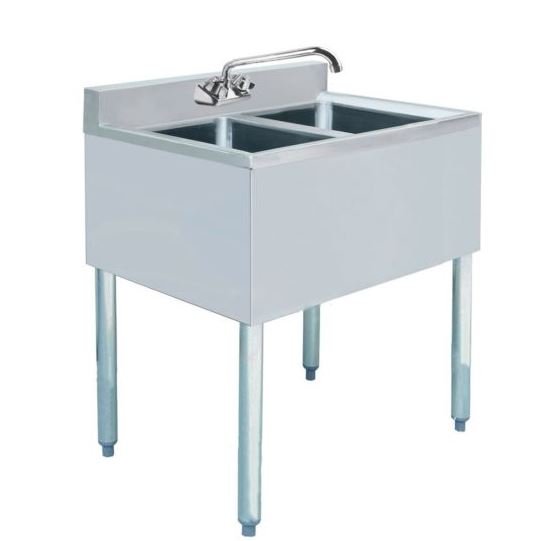 Conveniently wash your hands in between tasks with this Prepline stainless steel 2 bowl underbar hand sink with no drainboard. Featuring a 10″L x 10″D bowl and no drainboard, this Prepline hand sink includes 3″ backsplash, adjustable feet, pre-drilled faucet holes and comes with basket and drain, a great addition to your busy bars, restaurants, pubs, and other drink service establishments.