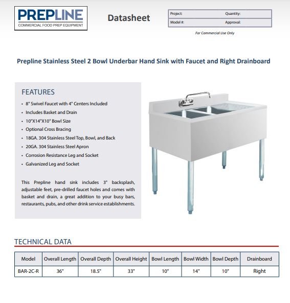Item:Prepline Stainless Steel 2 Bowl Underbar Hand Sink with Faucet and Right Drainboard- 36″ x 18″