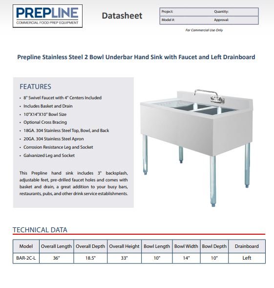 Conveniently wash your hands in between tasks with this Prepline stainless steel 3 bowl underbar hand sink with no drainboard. Featuring a 10″L x 10″D bowl and no drainboard, this Prepline hand sink includes 3″ backsplash, adjustable feet, pre-drilled faucet holes and comes with basket and drain, a great addition to your busy bars, restaurants, pubs, and other drink service establishments.