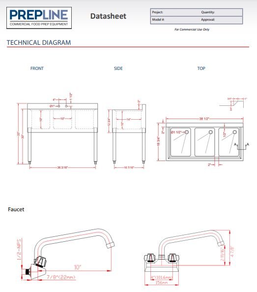 Item:Prepline Stainless Steel 3 Bowl Underbar Hand Sink and Faucet- 36″ x 18″