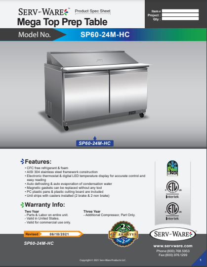 Serv-Ware 2 Door Mega Top, 24 Pan, Prep Unit SP60-24M-HC 12 cu. ft.