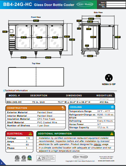 Temperature? 😕 33?F?41?F? ? ?Certification? : UL/cUL ? ? Weight? :416 lbs.