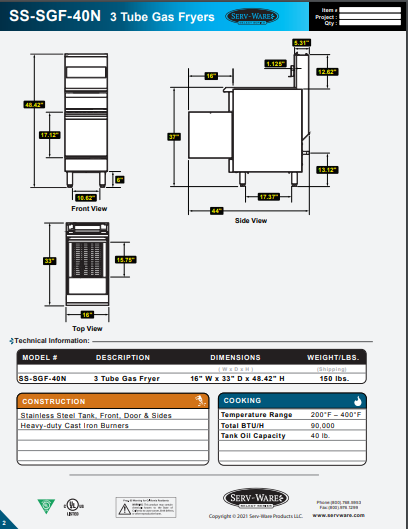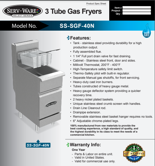 Serv-Ware Gas Fryer SS-SGF-40N 3 Tube Natural Gas