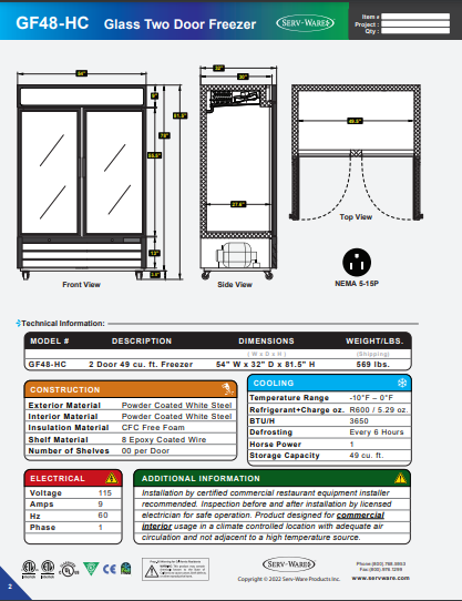 Volts? :115? ? ? Hertz:60? ?Phase:1? ?Amps :12? ?Storage Capacity :49 cu. ft. HP:1
