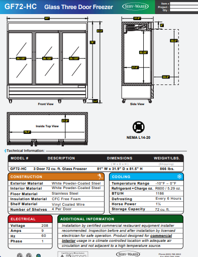 Volts? :115? ? ? Hertz:60? ?Phase:1? ?Amps :9.0? ? Storage Capacity :72 cu. ft.