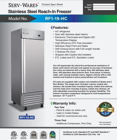 item : Serv-Ware One Door Reach-In Freezer RF1-19-HC