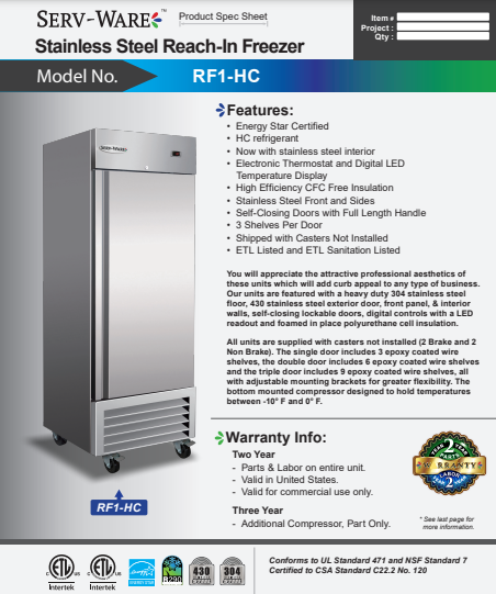 item : Serv-Ware One Door Reach-In Freezer RF1-HC