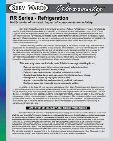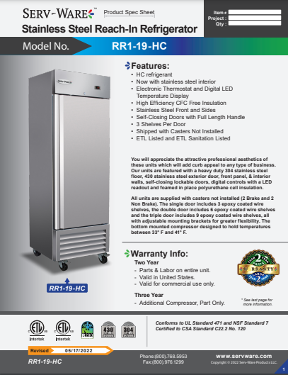 Serv-Ware RR Series Refrigerators are UL Safety and UL Sanitation Approved.