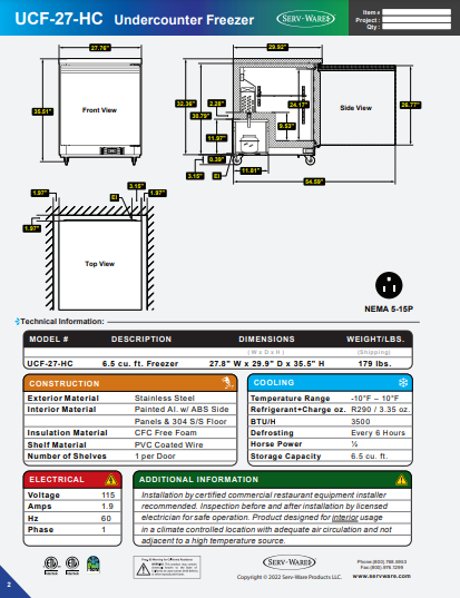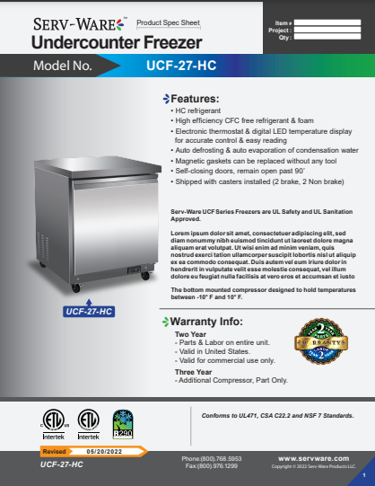 item : Serv-Ware Undercounter Freezer UCF-27-HC 6.5 cu. ft.