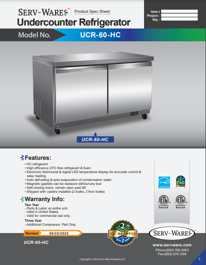 Serv-Ware Undercounter Refrigerator UCR-60-HC 15.5 cu. ft.