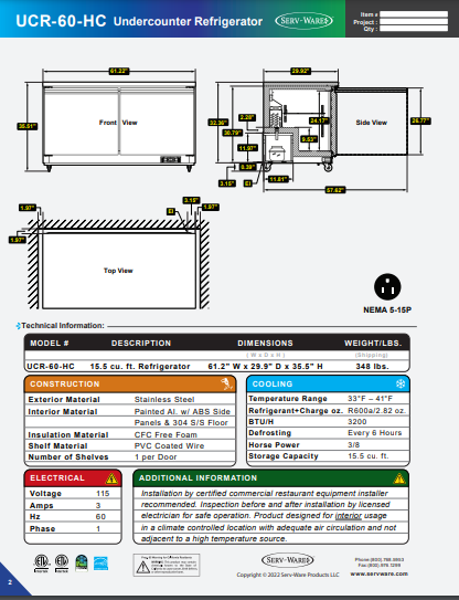 item : Serv-Ware Undercounter Refrigerator UCR-60-HC 15.5 cu. ft.