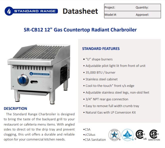 Item: Standard Range SR-CB12-M 12″ Gas Countertop Radiant Charbroiler – 35,000 BTU