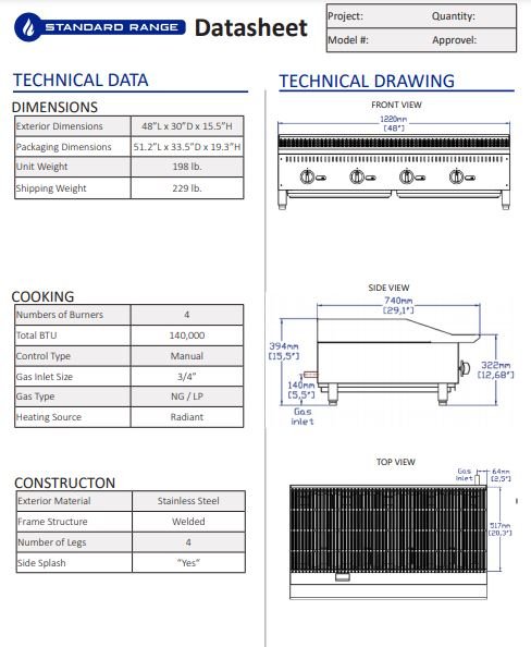 Item: Standard Range SR-CB48-M 48″ Gas Countertop Radiant Charbroiler – 140,000 BTU