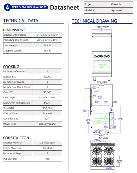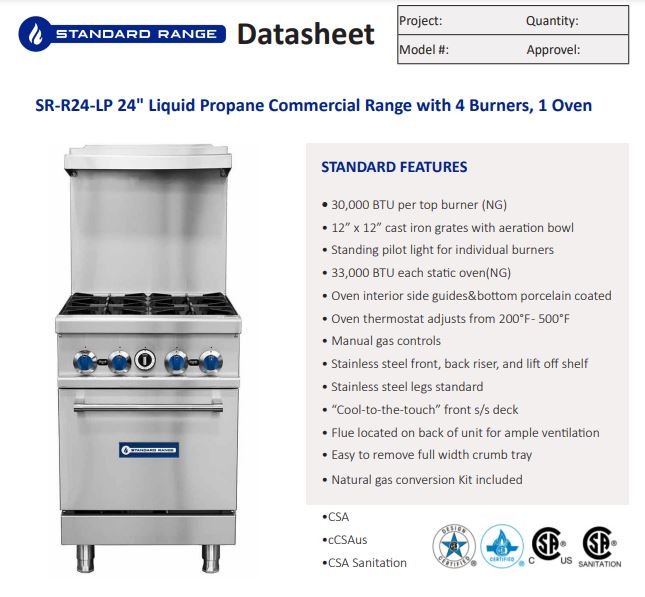 Item: Standard Range SR-R24-LP 24″ Natural Gas Commercial Range with 4 Burner, 1 Oven – 153,000 BTU